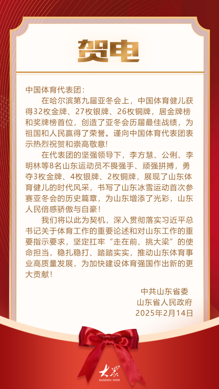当日,山东省委、省政府向中国体育代表团致贺电,全文如下: