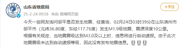 今天(2月24日),@山东省地震局 发布消息——