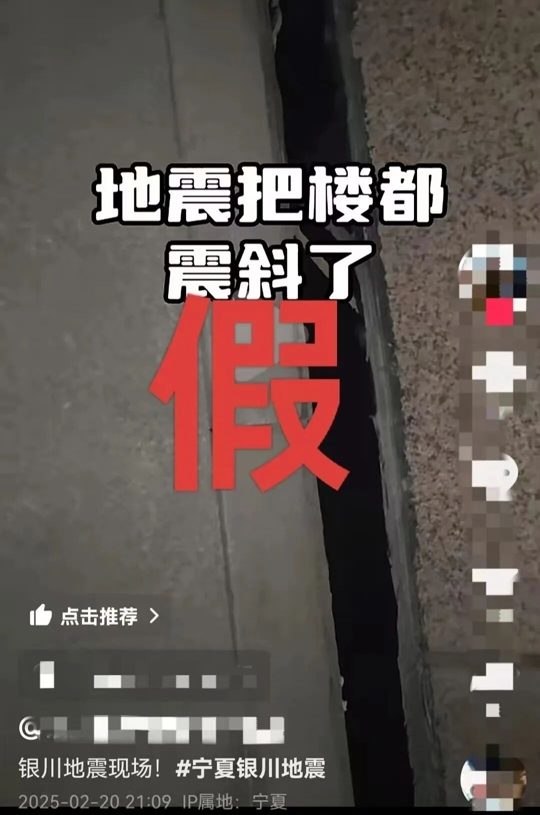 2月20日21时许,网警巡查发现,兴庆区网民李某在抖音平台上发布了涉及银川地震的视频,配文“地震把楼都震斜了”。经核实,该楼体间隙为前期施工所留,并非地震导致。