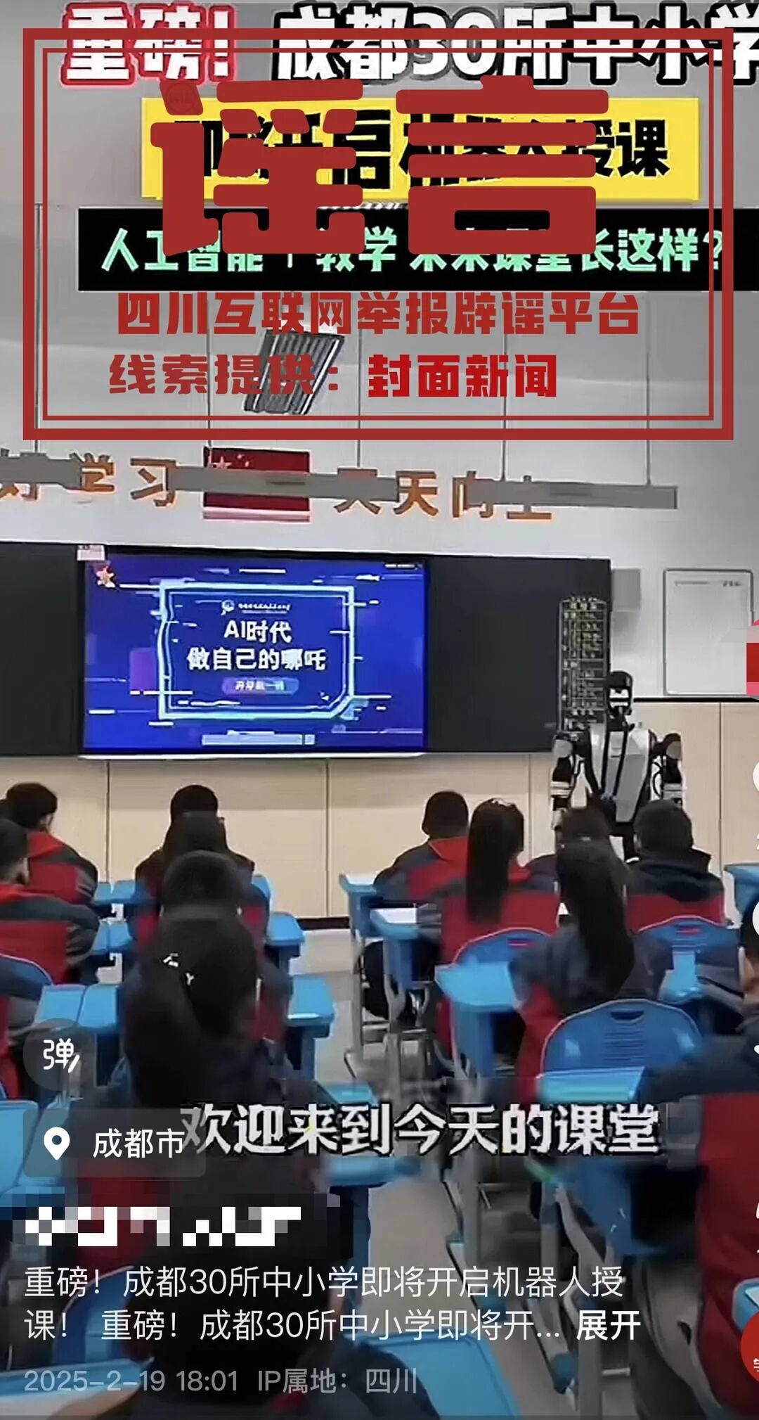 记者注意到,网传视频中的机器人授课画面,与2月17日“直播绵阳”发布的“绵阳造机器人主讲开学第一课”的视频内容一致。原视频中,机器人出现在课堂,是为参与“开学第一课”相关的展示活动,并非日常教学。