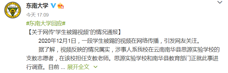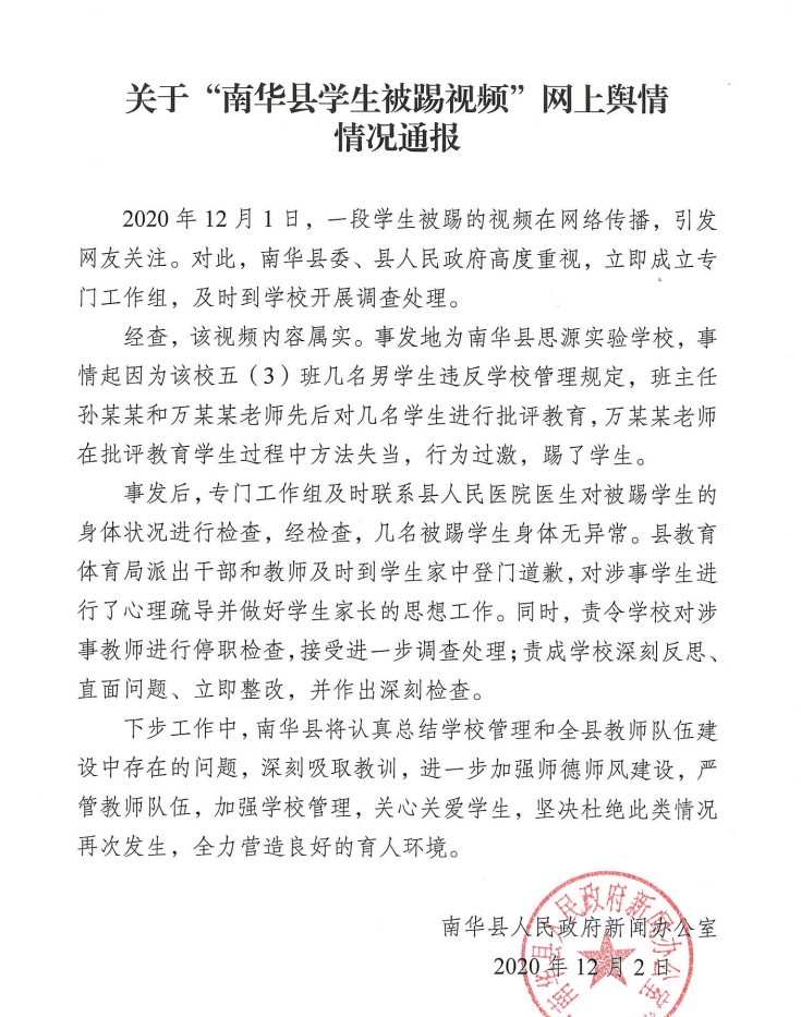 2020年12月1日,一段学生被踢的视频在网络传播,引发网友关注。