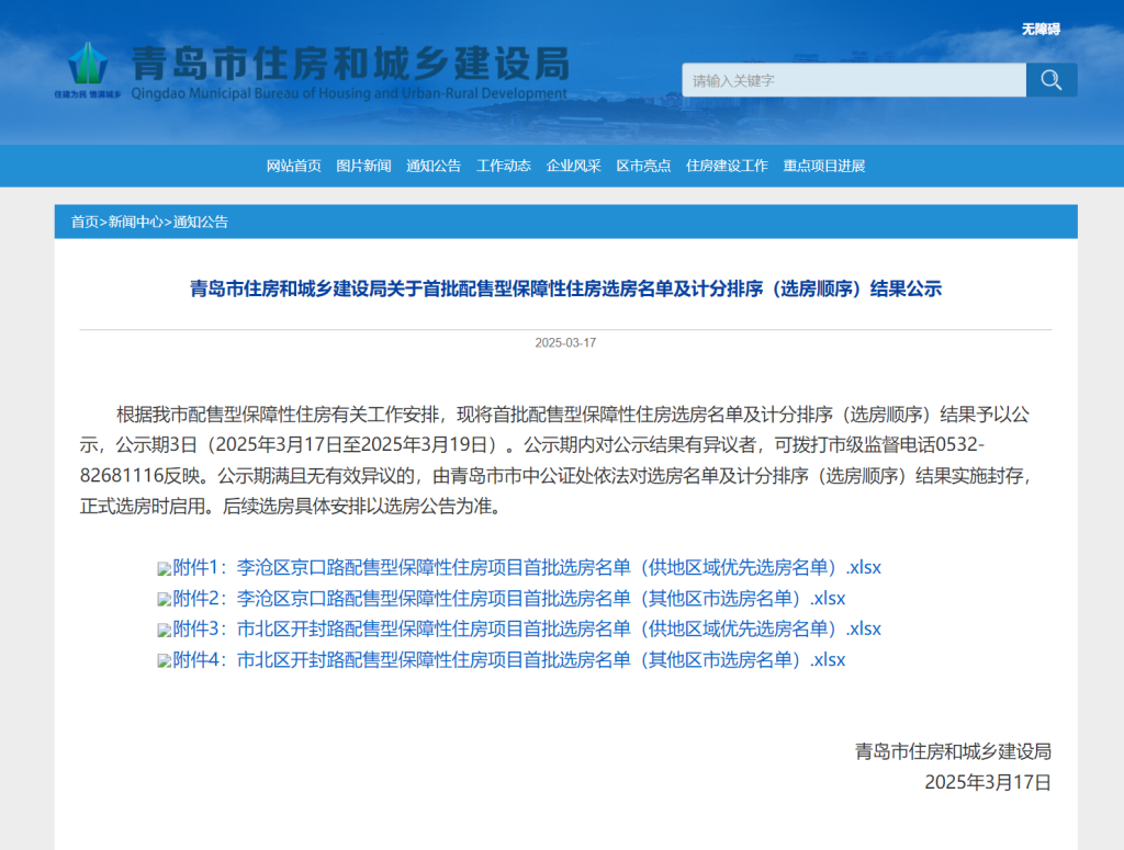 青岛日报社/观海新闻3月18日讯 3月17日,青岛市李沧区京口路、市北区开封路保障性住房项目选房名单正式公示,共有2094人入围。申请人可登录市住房城乡建设局官网及“青岛市配售型保障性住房轮候服务系统”(https://zhufang.qingdao.gov.cn/bsf)查询。