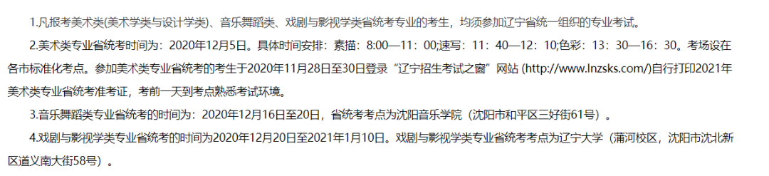 辽宁省招办下发《2021年辽宁普通高等学校招生艺术类专业省统考考生防疫须知》,对考生参加省统考过程中的疫情防控提出了具体要求,要求考生考前14天起,考生最好每日体温检测和健康状况检测,美术类考生、音乐舞蹈类和戏剧与影视学类考生需携带“辽事通健康通行码”绿码,经体温检测正常(低于37.3℃)后,可进入考点参加考试。点击http://www.lnzsks.com/newsinfo/IMS_20201103_39005_YnsIDQ9apM.htm查看详情。