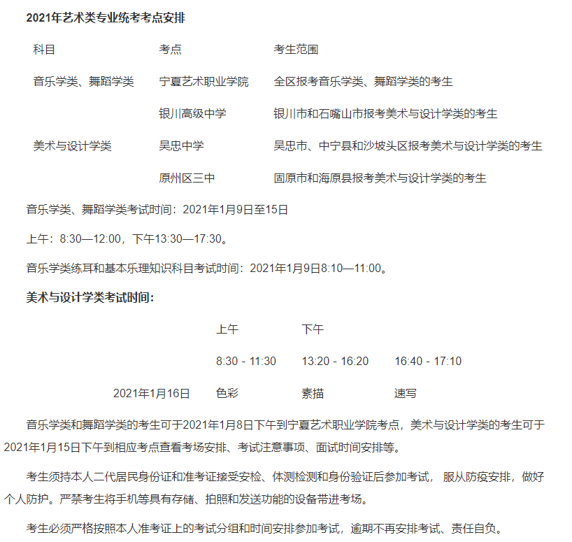 《青海省高等学校招生委员会关于做好2021年普通高等学校艺术类专业考试招生工作的通知》明确要加强疫情防控,确保考试安全,对考生考试防疫要求点击http://www.qhjyks.com/docs/20201201144139452904.pdf查看详情。