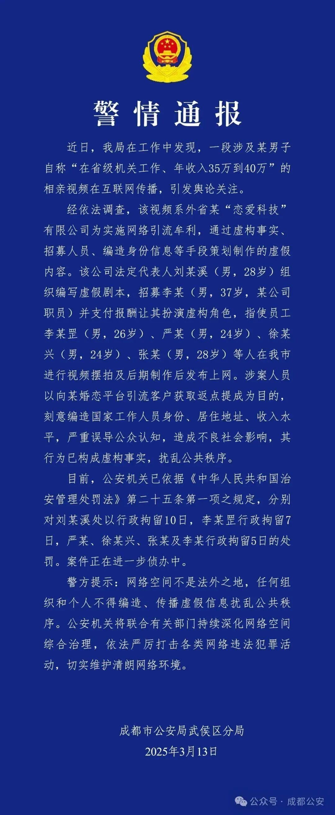 经依法调查,该视频系外省某“恋爱科技”有限公司为实施网络引流牟利,通过虚构事实、招募人员、编造身份信息等手段策划制作的虚假内容。该公司法定代表人刘某溪(男,28岁)组织编写虚假剧本,招募李某(男,37岁,某公司职员)并支付报酬让其扮演虚构角色,指使员工李某罡(男,26岁)、严某(男,24岁)、徐某兴(男,24岁)、张某(男,28岁)等人在我市进行视频摆拍及后期制作后发布上网。涉案人员以向某婚恋平台引流客户获取返点提成为目的,刻意编造国家工作人员身份、居住地址、收入水平,严重误导公众认知,造成不良社会影响,其行为已构成虚构事实,扰乱公共秩序。