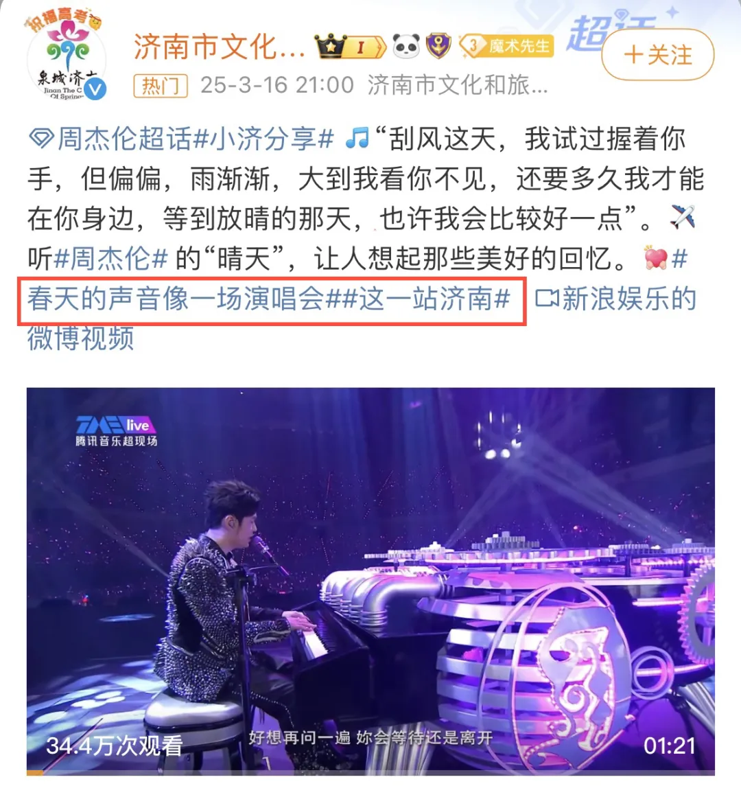 此前,济南市文化和旅游局3月16日发微博也提到过周杰伦演唱会,并挂话题#这一站济南。山东省文化和旅游厅就此正式确认了演唱会的消息!没有辜负歌迷们的期待!