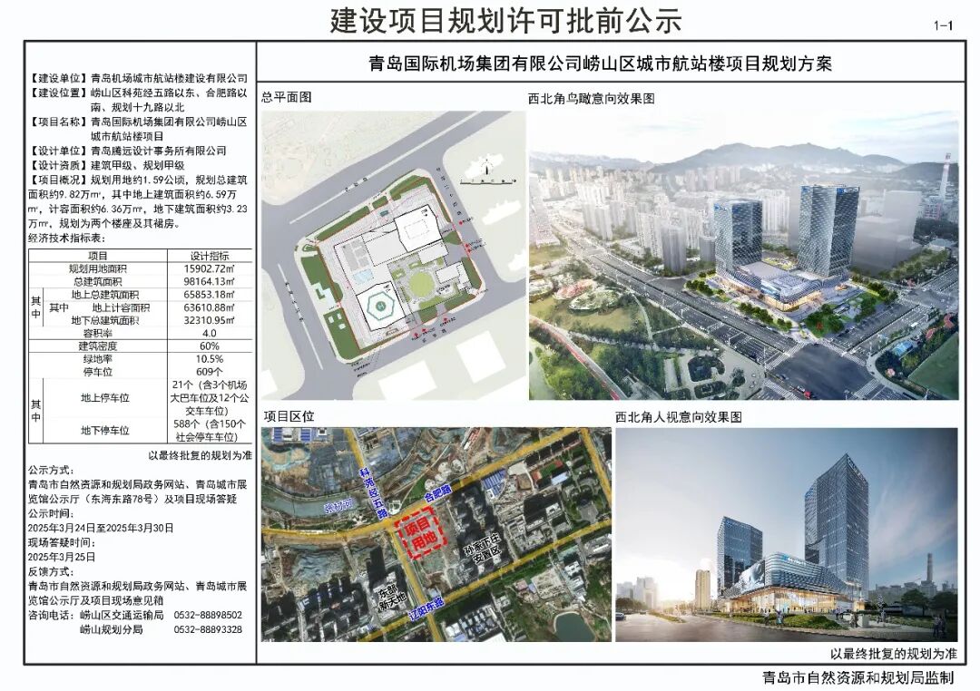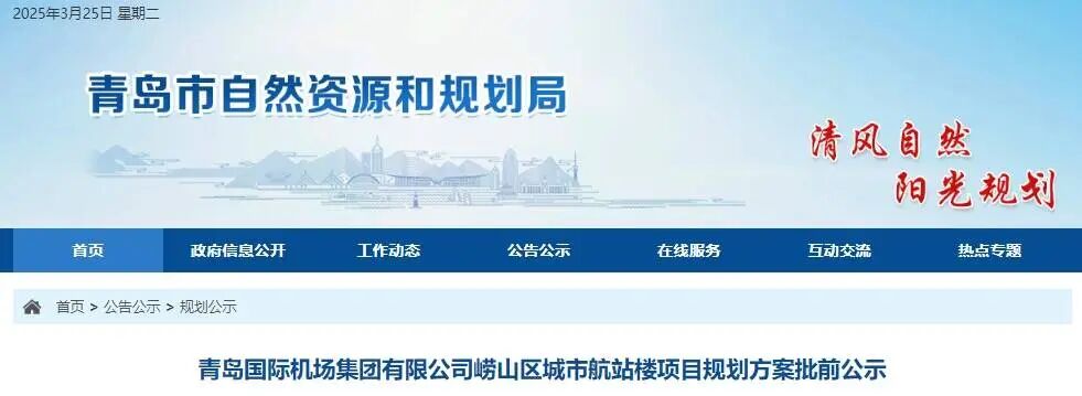 3月24日,青岛市自然资源和规划局发布崂山区城市航站楼项目规划。