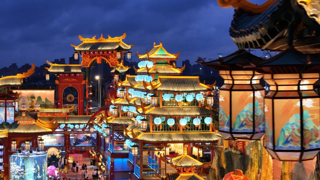 青岛明月山海间打造了海梦奇潭、雨林蜃境、熔岩浅浆、万象山海四大主题街区,带你沉浸式体验一场流光溢彩的国潮奇妙游。光影变幻间,山峦起伏,云雾缭绕,在这里,每一步都像是在历史的画卷中漫步。