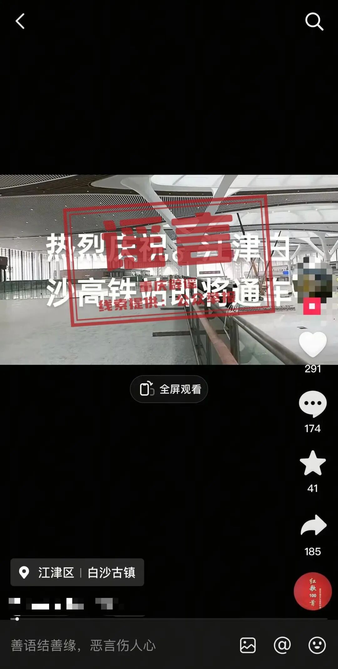近日,某网民在互联网平台发布信息称“热烈庆祝。江津白沙高铁站即将通车”。经核实,网传信息系谣言。