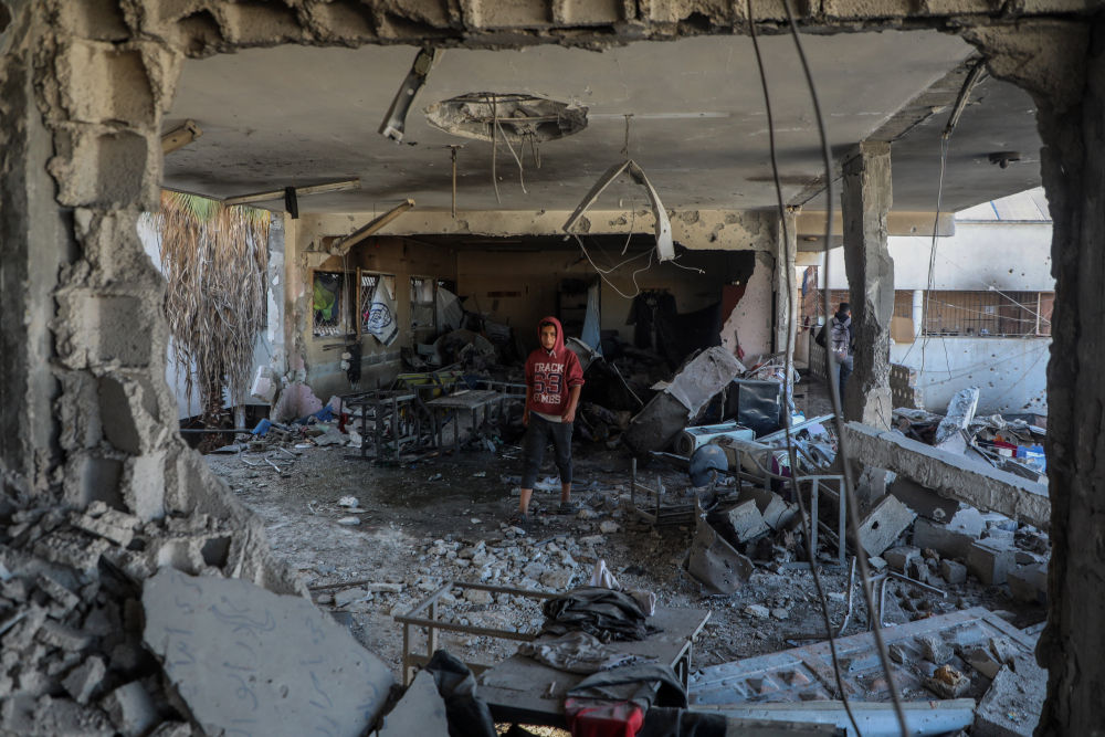 4月25日,在加沙城一所学校,民众查看以军袭击后的废墟。新华社发(里泽克·阿卜杜勒贾瓦德摄)
