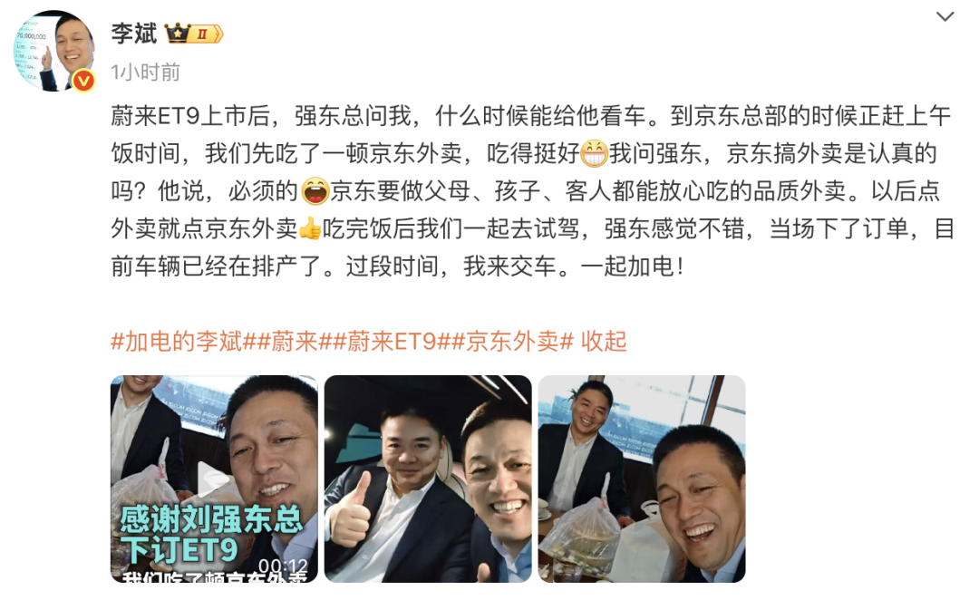 4月9日,蔚来创始人李斌晒出与京东创始人刘强东一起吃外卖的合影。