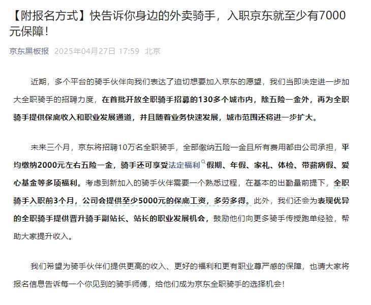 4月27日,京东黑板报发文称,京东计划在未来三个月招聘10万名全职骑手,平均缴纳2000元左右五险一金,全职骑手入职前3个月,公司会提供至少5000元的保底工资。
