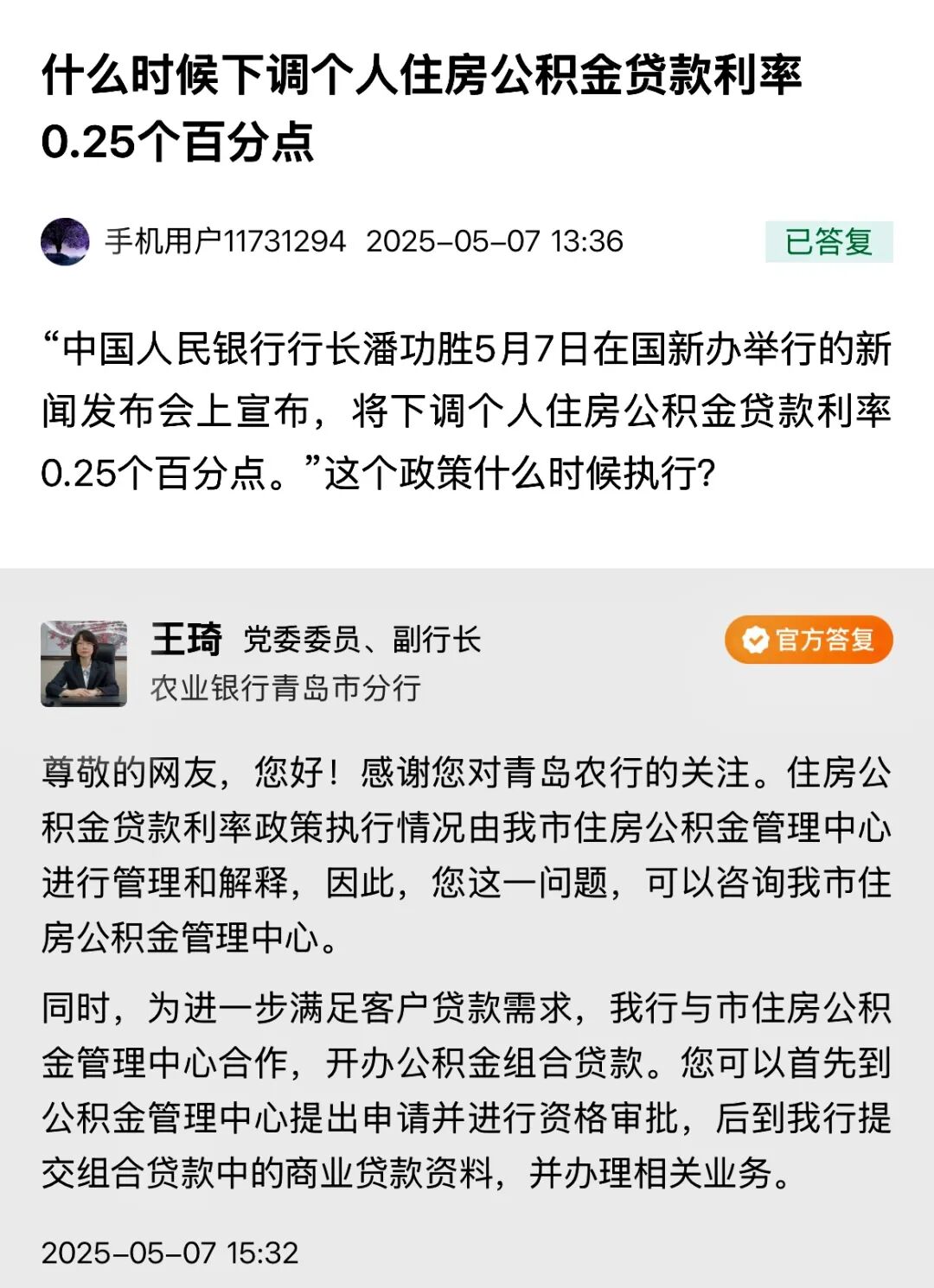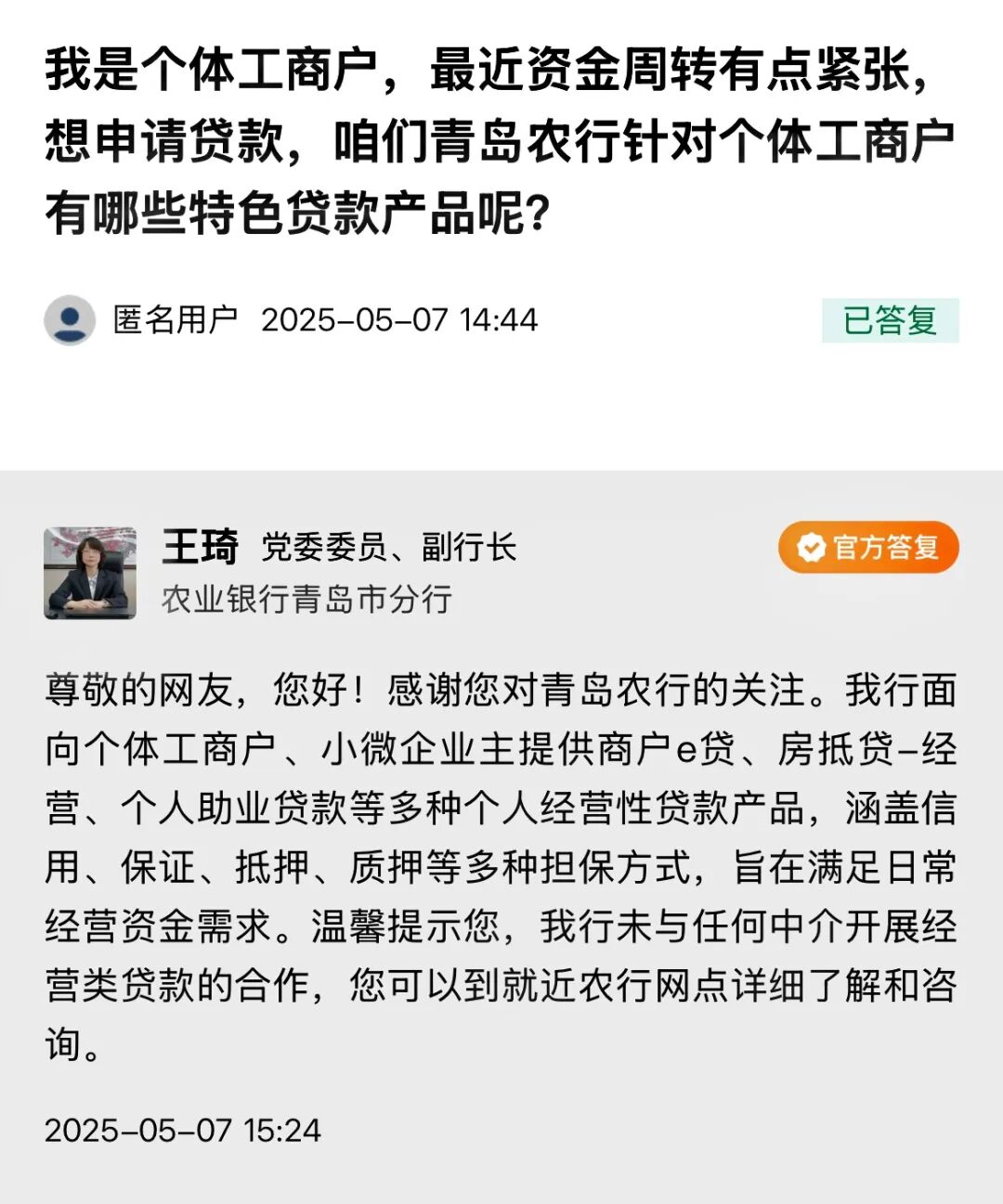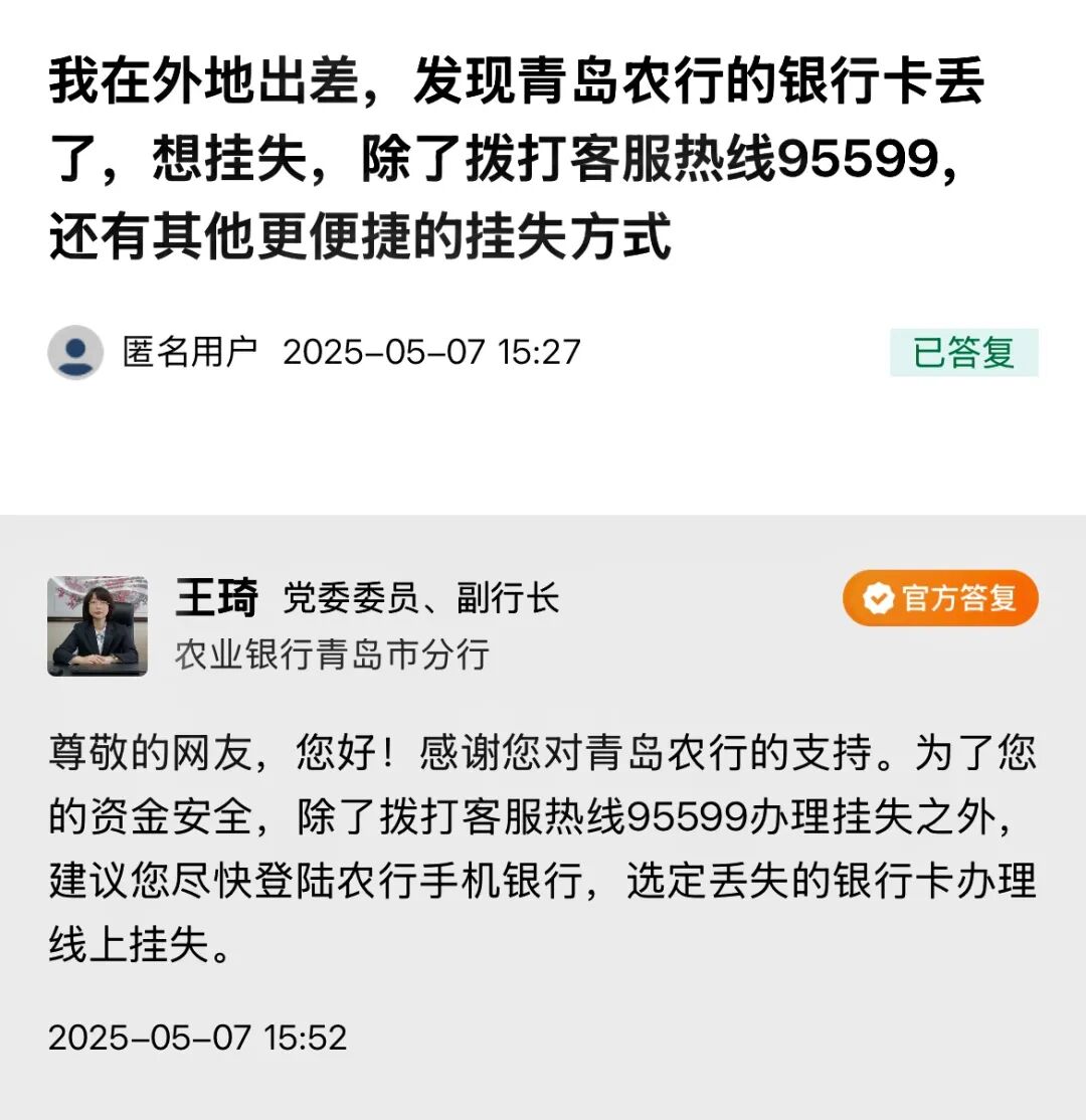 青岛日报/观海新闻5月7日讯 今天下午,中国农业银行青岛市分行党委委员、副行长王琦做客民生在线,与网民在线交流。