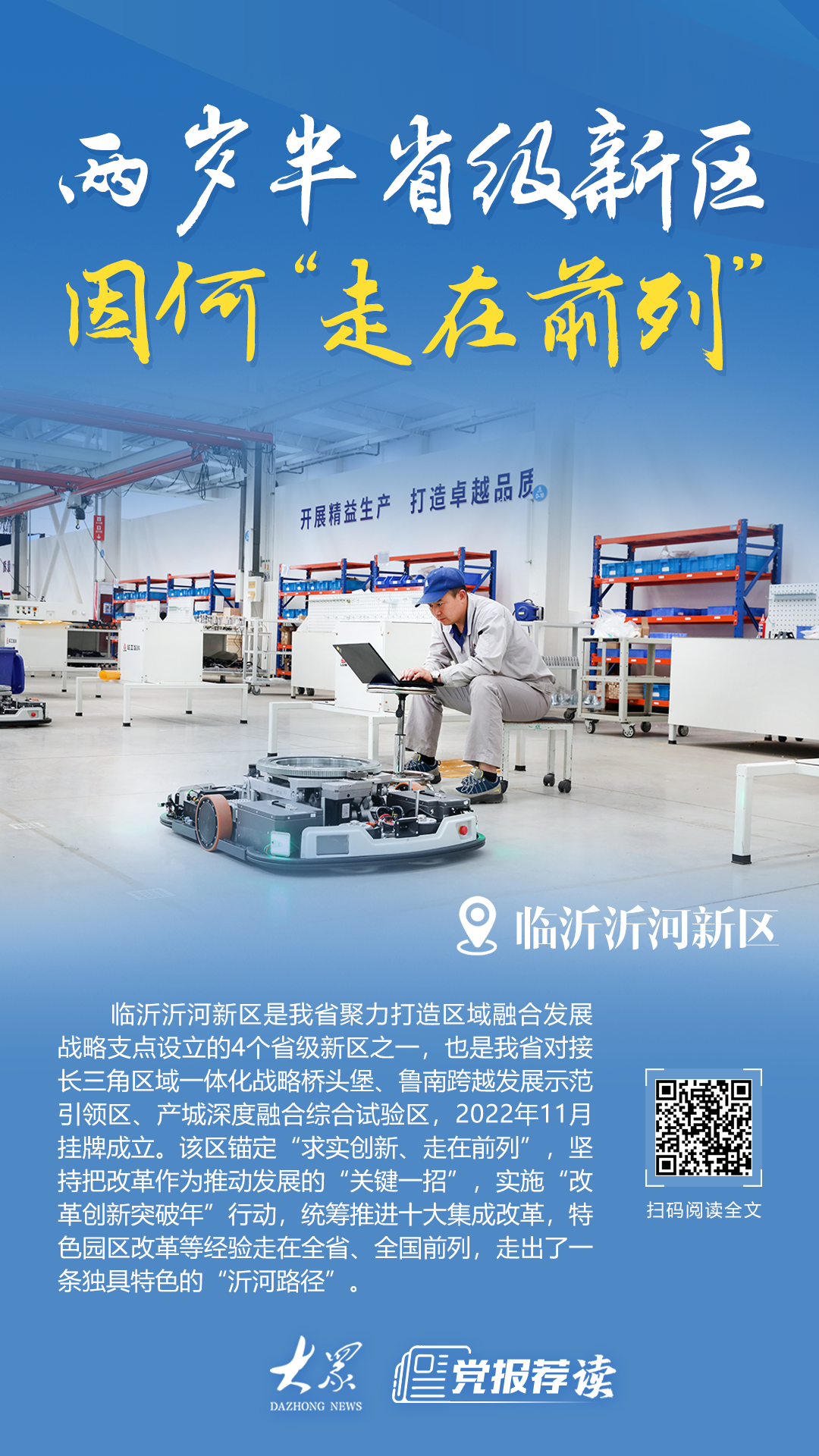 沂河新区是我省聚力打造区域融合发展战略支点设立的4个省级新区之一,也是我省对接长三角区域一体化战略桥头堡、鲁南跨越发展示范引领区、产城深度融合综合试验区,2022年11月挂牌成立。该区锚定“求实创新、走在前列”,坚持把改革作为推动发展的“关键一招”,实施“改革创新突破年”行动,统筹推进十大集成改革,特色园区改革等经验走在全省、全国前列,走出了一条独具特色的“沂河路径”。沂河新区党工委副书记,临沂经济技术开发区服务中心主任、党委书记苗晓峰说:“在以改革创新破局,探索特色发展之路方面,沂河新区围绕重塑体制机制,优化资源配置,创优营商环境,激活市场主体,为高质量发展注入了强劲动能。”