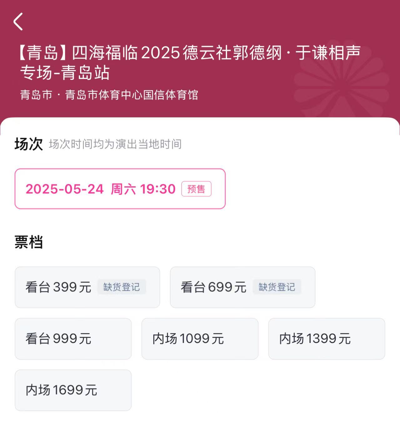 观海新闻自大麦App获悉,四海福临2025德云社郭德纲·于谦相声专场-青岛站已开票。票价范围在399-1699元不等。5月24日19:30,将在青岛国信体育馆演出。