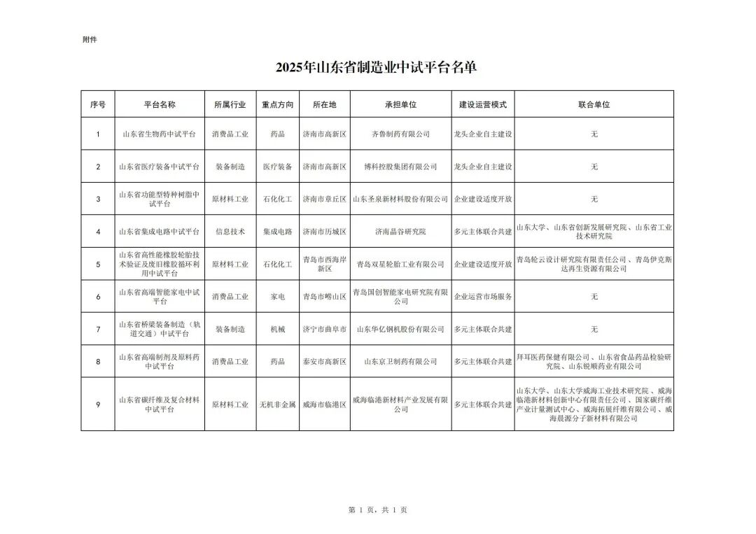 为贯彻落实《制造业中试创新发展实施意见》(工信部联科〔2024〕11号)和《山东省制造业中试创新发展实施方案》(鲁工信发〔2024〕12号)有关要求,加快布局建设一批制造业高质量发展急需的中试平台,提高科技成果转化和产业化水平,省工业和信息化厅组织开展了省级制造业中试平台培育建设工作。经自愿申报、各市初审推荐、专家评审、现场核查、网上公示等程序,确定了齐鲁制药有限公司承担建设的山东省生物药中试平台等9家平台为2025年山东省制造业中试平台,现将名单予以公布。