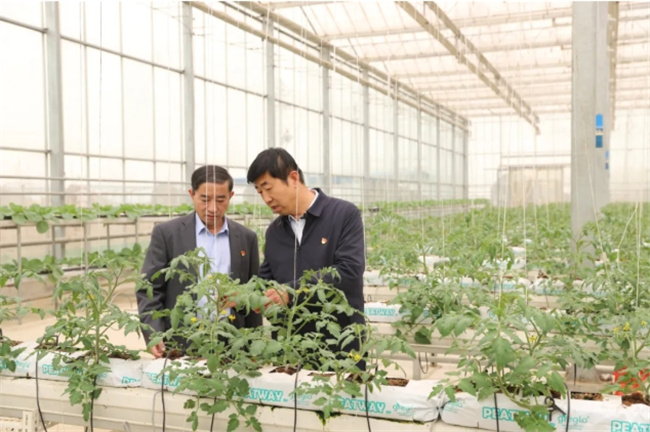 步同良(左)到耿店村了解蔬菜大棚生长情况