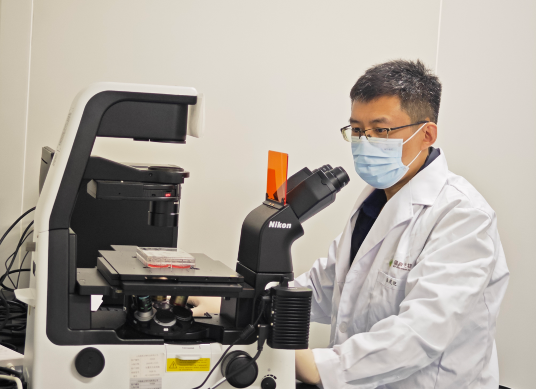 山东维真生物科技有限公司基础试剂生产部部长张茂迎,正在观察细胞转染效率。