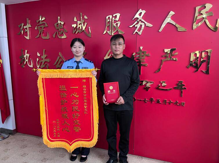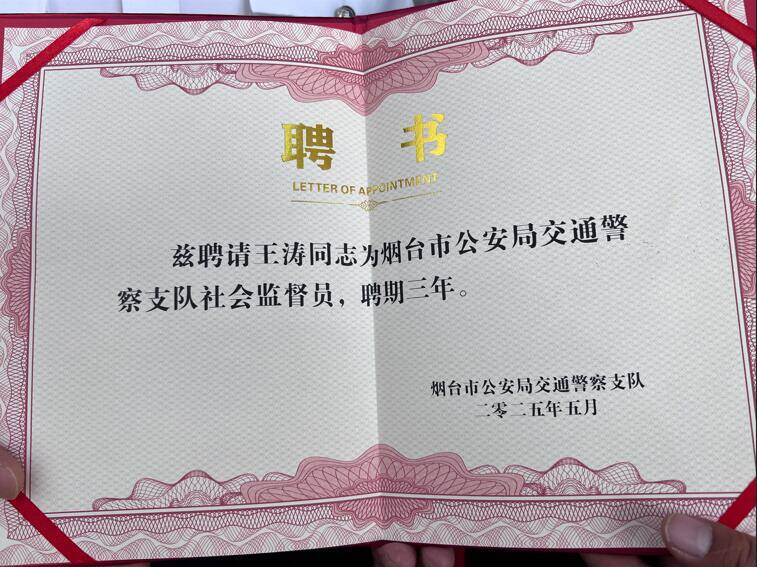齐鲁网·闪电新闻5月15日讯 15日上午,烟台市公安局交通警察支队特聘为救心梗休克考生连闯6个红灯的网约车司机王涛为“社会监督员”,现场为其颁发聘书,王涛则向当天接警民警送上锦旗。