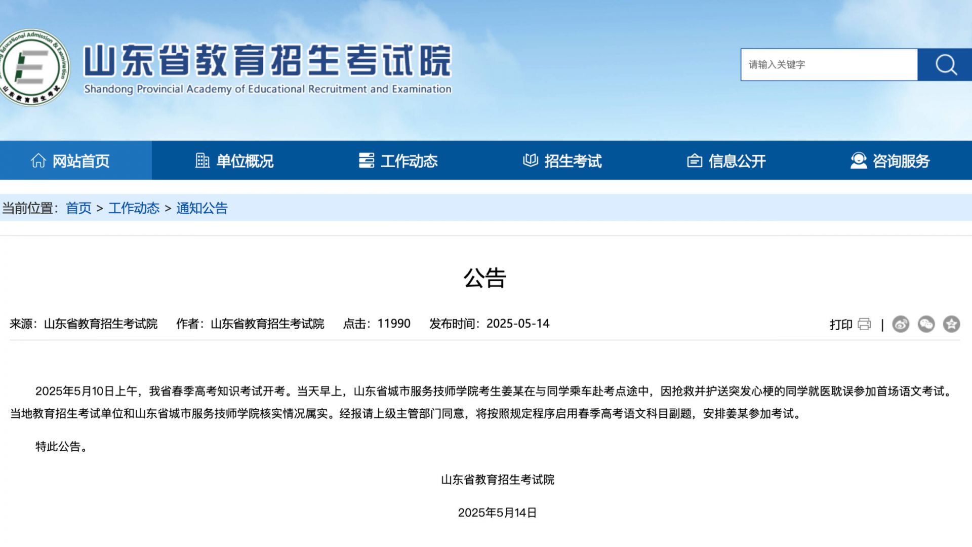 在室友得到医院妥善救治后,姜昭鹏才迅速赶往考场进行考试,但由于迟到时间过长,导致当天上午语文考试缺考。