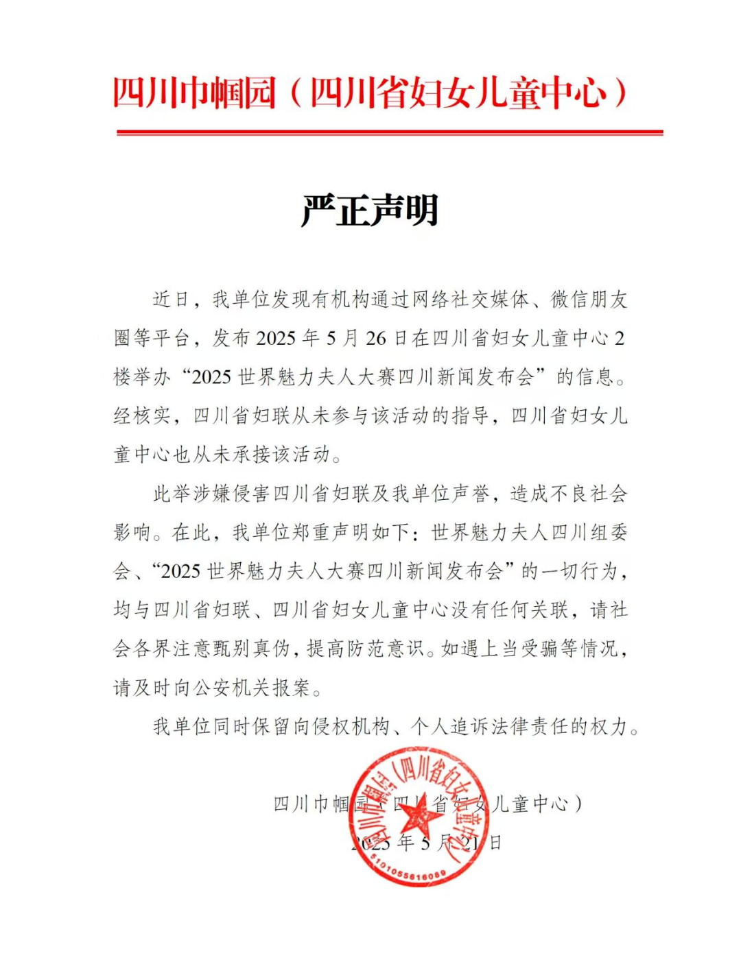 此举涉嫌侵害四川省妇联及我单位声誉,造成不良社会影响。在此,我单位郑重声明如下:世界魅力夫人四川组委会、“2025世界魅力夫人大赛四川新闻发布会”的一切行为,均与四川省妇联、四川省妇女儿童中心没有任何关联,请社会各界注意甄别真伪,提高防范意识。如遇上当受骗等情况请及时向公安机关报案。