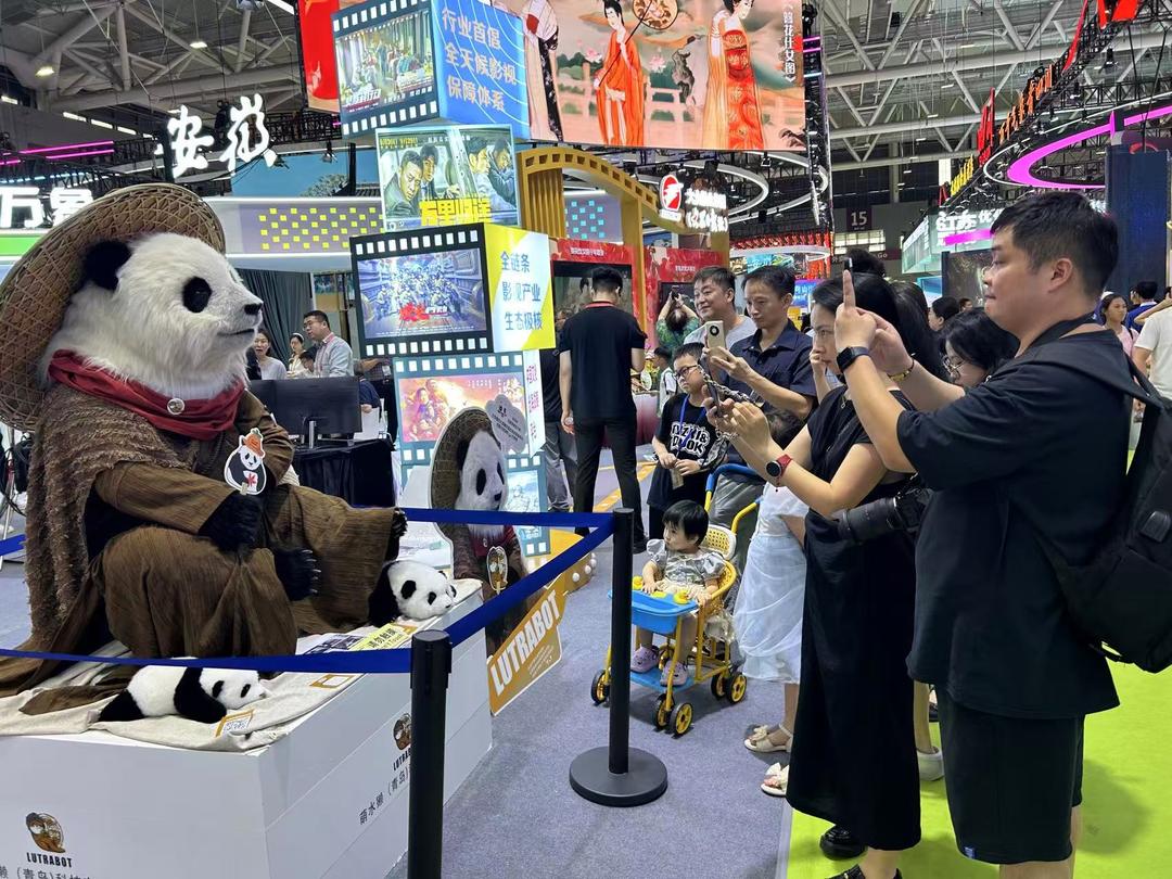萌水獭科技在山东展区展示机器仿生熊猫,能即时捕捉人的面部动作,做出各种趣味表情,引来观众围观体验。