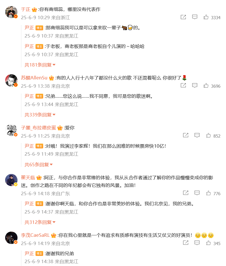 尹正发长文后,于正、苏醒、万合天宜导演刘循子墨、李茂等圈内人纷纷留言力挺“你很好了。”“你在我心里就是一个有追求有质感有演技有生活又仗义的好演员!”“你在我心里就是一个有追求有质感有演技有生活又仗义的好演员!”
