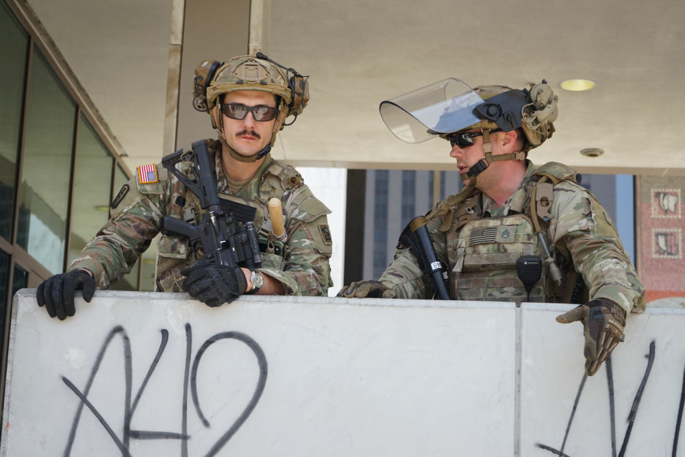 6月8日,国民警卫队人员在美国加利福尼亚州洛杉矶市中心的联邦执法机构门前警戒。新华社发(邱晨摄)