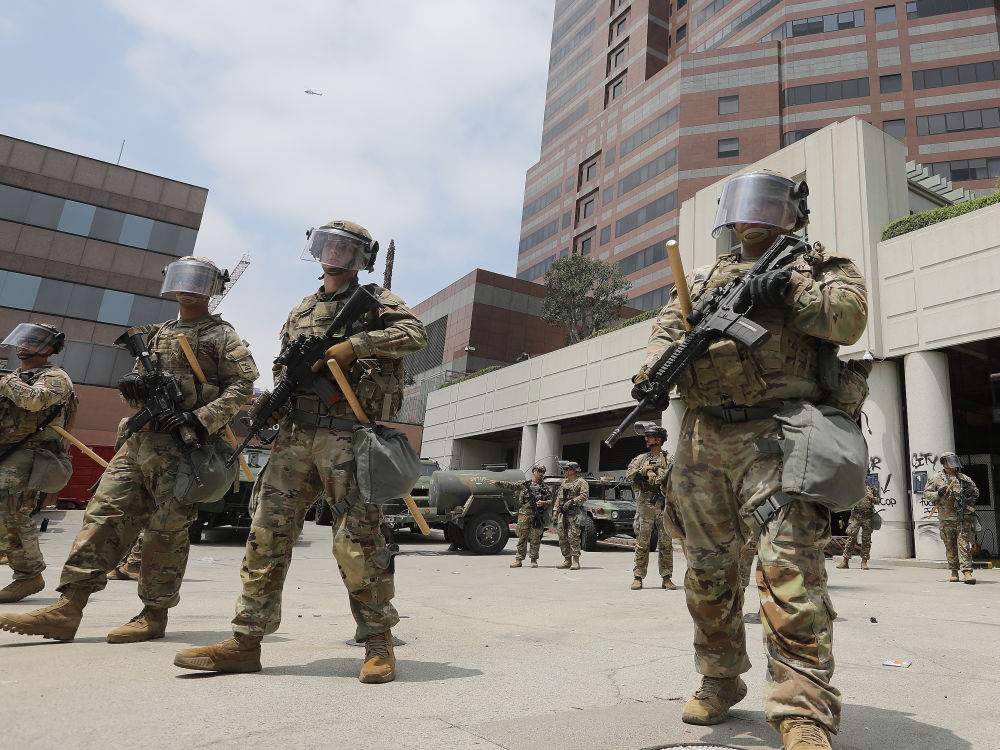 6月9日,国民警卫队人员在美国加利福尼亚州洛杉矶一处联邦机构建筑外警戒。新华社发(曾慧摄)
