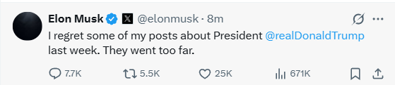 马斯克在社交媒体X上发文说:“我对自己上周发的关于总统特朗普的一些帖文感到后悔。它们太过了。”
