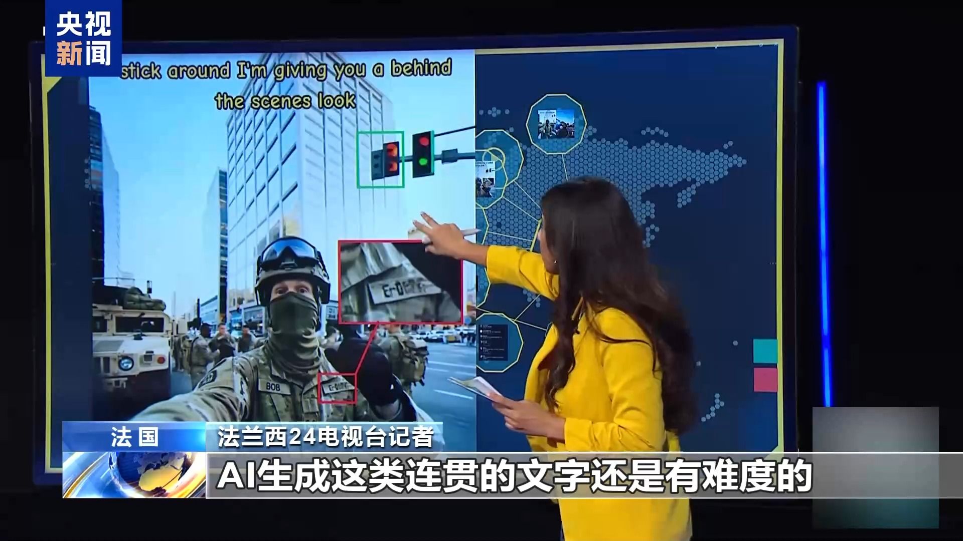 法兰西24电视台记者:如果我们仔细看这些截屏,比如鲍勃的胸章。正常来讲应该有他的军衔在上面,但现在却是一段乱码。如果是人工智能生成的这就可以理解了,AI生成这类连贯的文字还是有难度的。还有这里的红绿灯也很奇怪,这里少了黄灯,这边所有的颜色都糊到一起了。