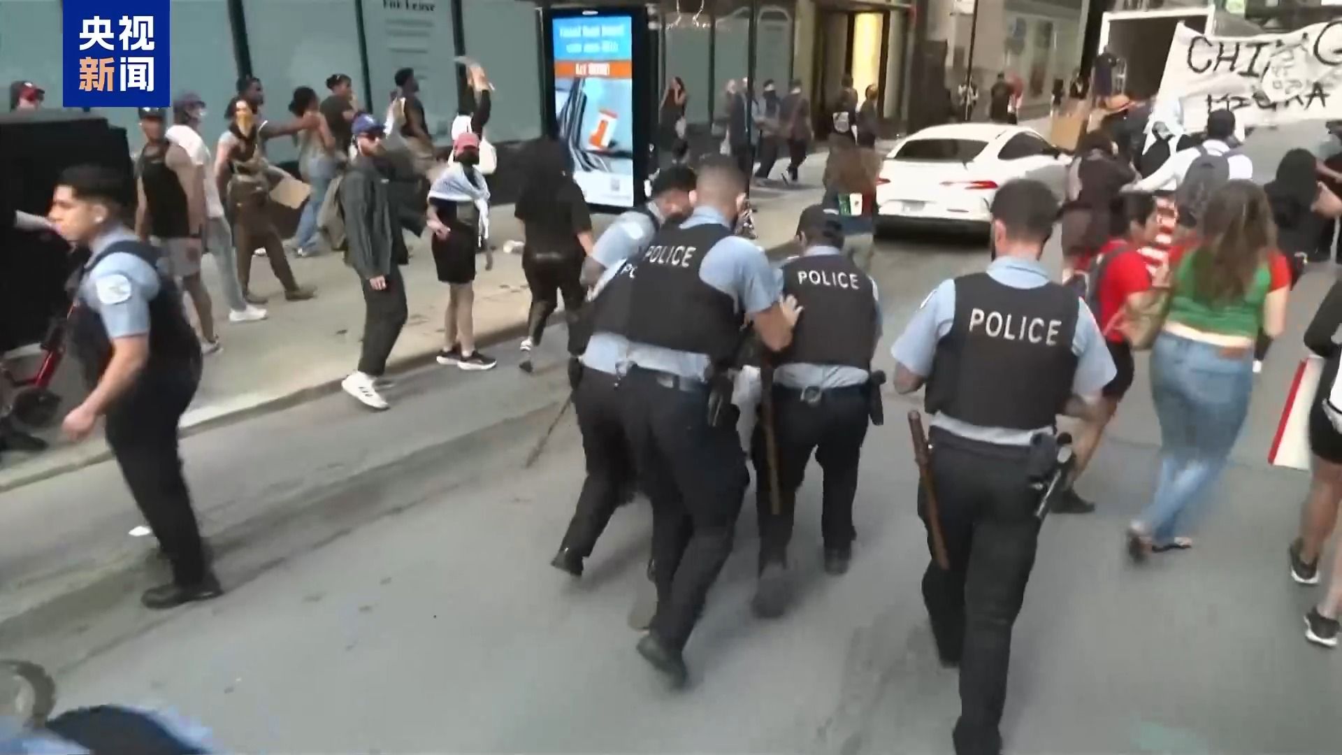 在芝加哥,抗议者在游行过程中与警方发生推搡和冲突。混乱中,多人遭警方逮捕。
