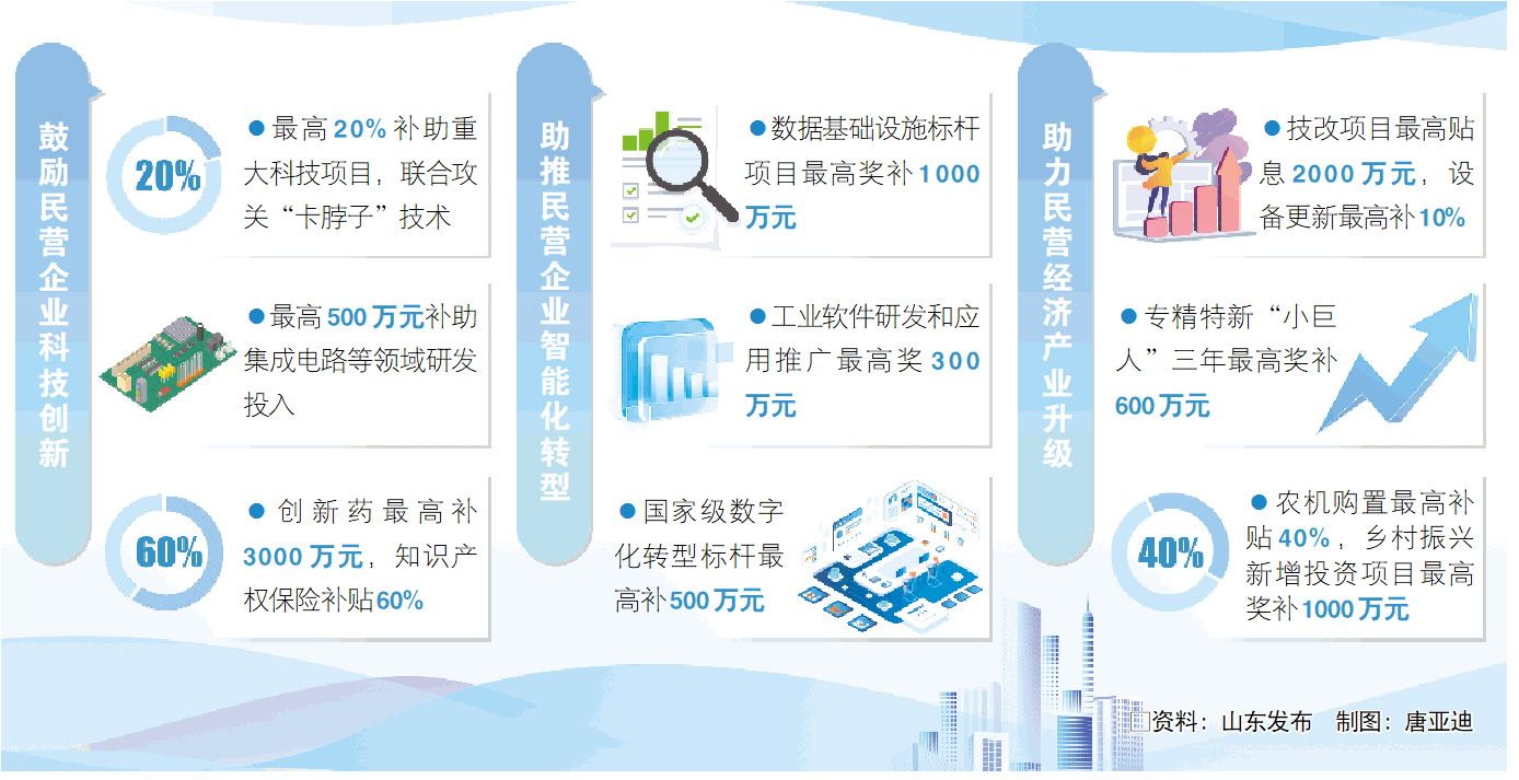 助力民营经济转型发展,包括3个方面13条政策。其中,在推动产业升级方面,实施技改专项贷贴息、设备更新补贴,培育国家级专精特新“小巨人”企业,鼓励民营企业参与乡村振兴。在增强外贸企业发展动能方面,实施“鲁贸贷”融资业务、支持民营企业参加境外展会,增强外贸竞争力。在支持服务业发展方面,鼓励民营企业承担服务业重点项目建设,参与养老、家政等民生事业发展。这些政策针对性强,比如,每年择优支持不少于200个服务业重点项目,其中组织民营企业参与申报的比例不低于50%;对重大工业技改项目,省级最高贴息2000万元。