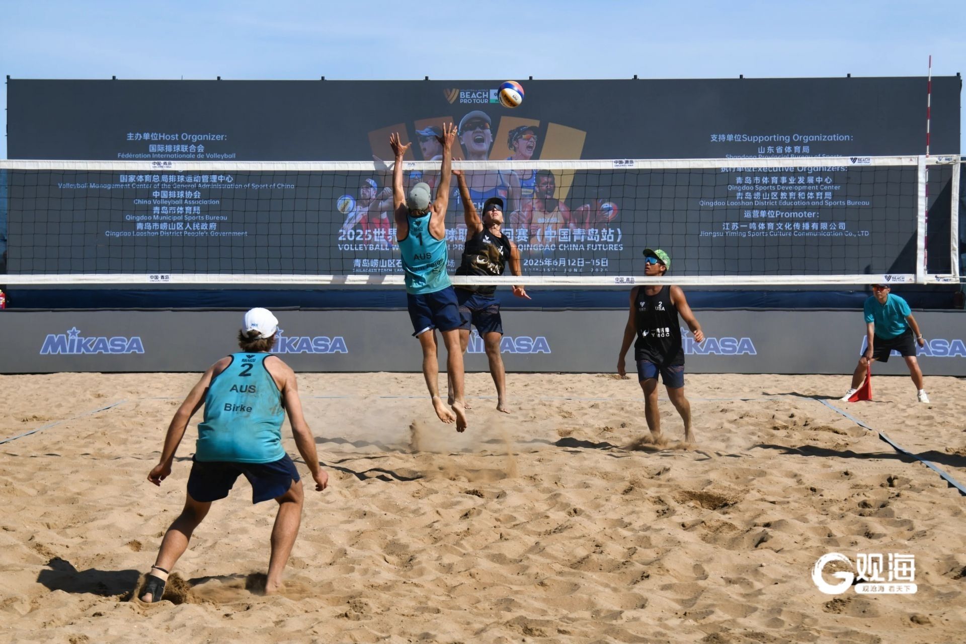 青岛日报社/观海新闻6月12日讯 金色的沙滩铺展成天然赛场,细软的沙粒在阳光下闪烁,与远处湛蓝的海水交相辉映。 今天,2025世界沙滩排球职业巡回赛(中国青岛站)在石老人海水浴场正式开打。澄澈的天空下,运动员们矫健的身影高高跃起,挥臂扣杀,划出一道充满力量的弧线。海风裹挟着咸涩的热情,观众的欢呼声与潮汐的节拍共鸣,将这片海滨化作竞技与浪漫交织的舞台。
