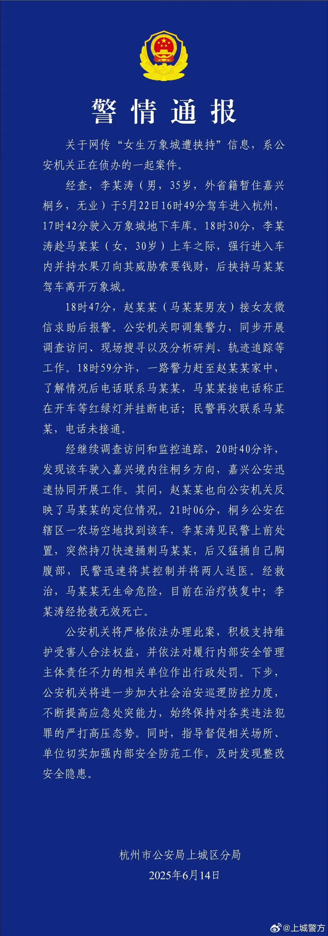 杭州警方通报“女子在万象城地下车库遭绑架”:李某涛(男,35岁)自杀身亡 2025-06-14 19:50 @上城警方 0 6月13日,“女生万象城地下车库遭绑架”一事引发关注。刚刚,杭州上城警方发布了最新通报: 责任编辑:程雪涵