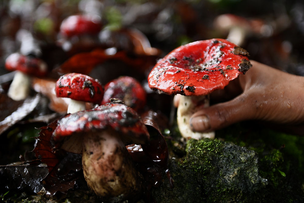 在云南省大理白族自治州南涧彝族自治县公郎镇,村民采摘大红菌。新华社发(适志宏摄)