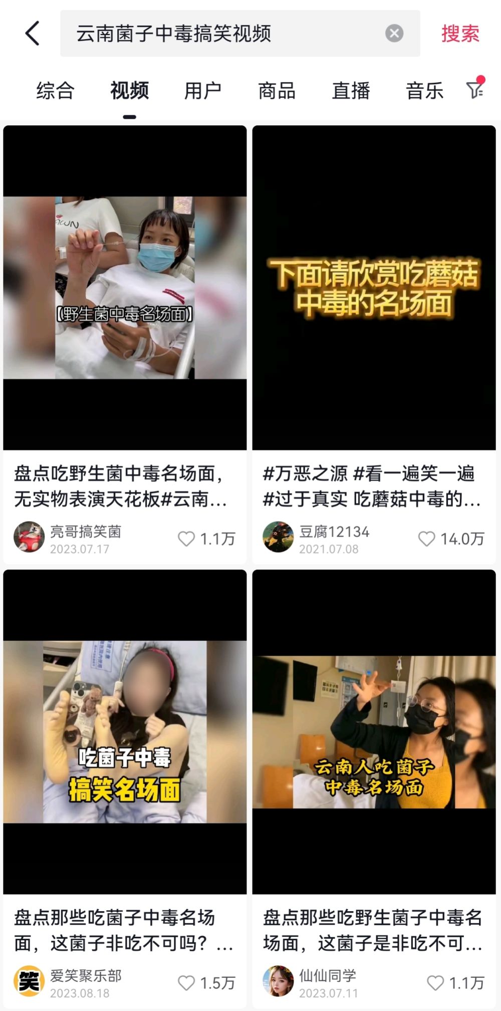 记者在相关平台输入“野生菌中毒、云南菌子中毒搞笑视频”等关键词,就会出现众多相关短视频,标题直接写着:吃菌子中毒搞笑名场面,吃野生菌中毒后无实物表演,一年一度抓小精灵的季节到了……打开视频,欢快的配乐,加上逗趣的对话,让人实在难以和急诊室里的“中毒”症状联系起来。