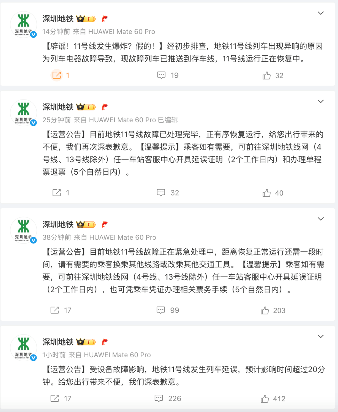 “深圳11号线出现爆炸声冒烟”“11号线,车缓行到碧海湾,到站就说要让我们下车,然后听到爆炸声”……
