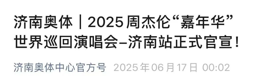 6月17日凌晨,济南奥体中心官方号发布文章,周杰伦“嘉年华”世界巡回演唱会济南站正式官宣!