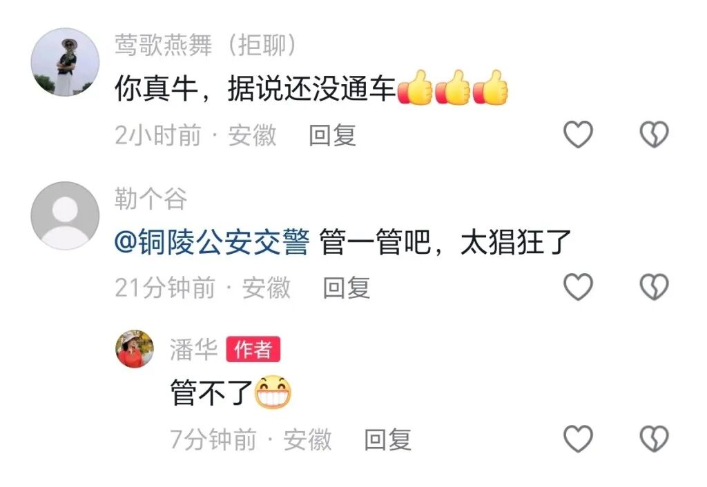 此外,在网友“潘华”发布的短视频评论区,有网友@铜陵公安交警,请铜陵交警部门管一管这种“太猖狂”的行为。“潘华”对此回复:“管不了。”上述文章指出,近年来,一些网红为了流量,不择手段,毫无敬畏感,对法律法规视若无物。铜陵官方应彻查此次G3铜陵长江公铁大桥炫耀事件真相,依法依规处理。