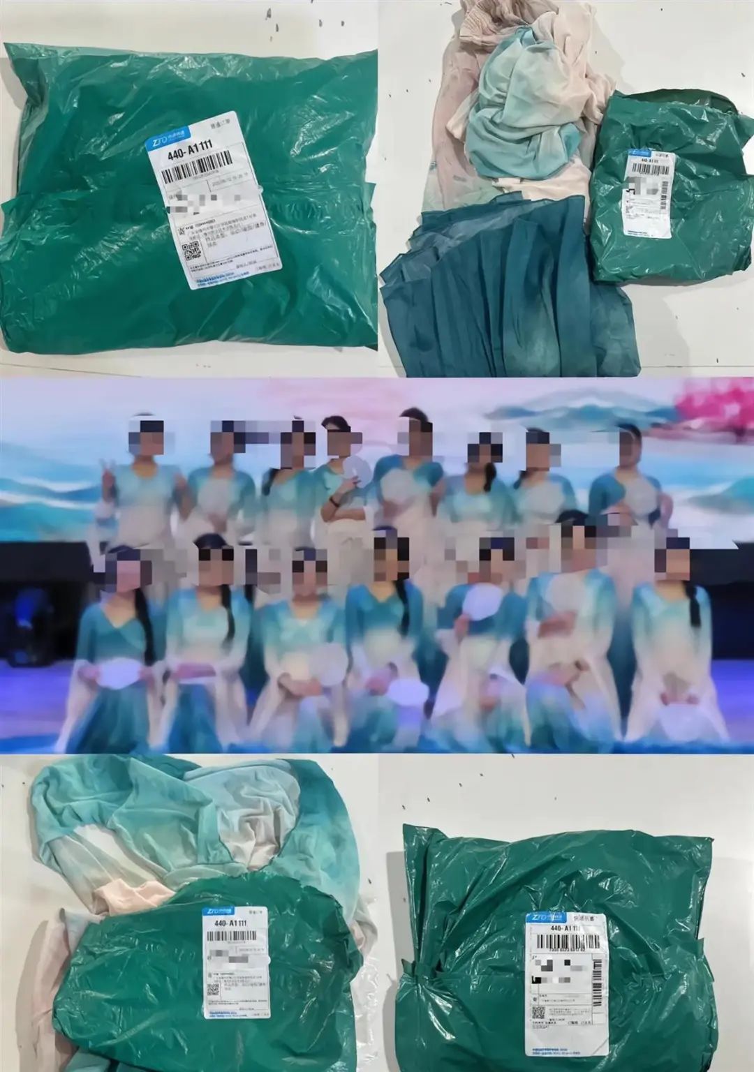店主展示的包裹收货地址均为广东省梅州市梅江区学院路梅职院北1号菜鸟驿站,备注学校为梅州一职业技术学院北区。记者还注意到,其中一张演出截图中,十五名女生身着与店主展示几乎相同的演出服,上身为淡绿色上衣,下身为深绿色裤裙,在台上手拿扇子进行表演。