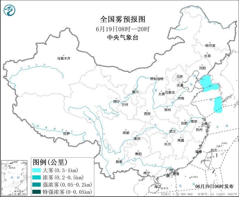 预计,6月19日白天,黄海北部海域、黄海中部部分海域、黄海东南部海域将有能见度不足1公里的大雾。