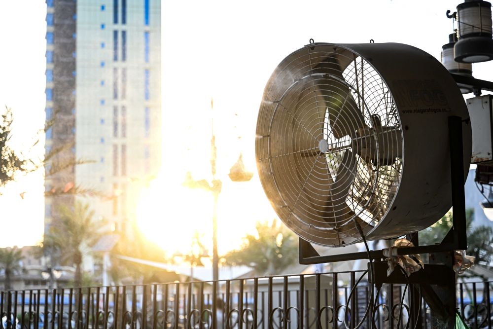 这是6月18日在科威特首都科威特城拍摄的用于降温的风扇。新华社发(阿萨德摄)