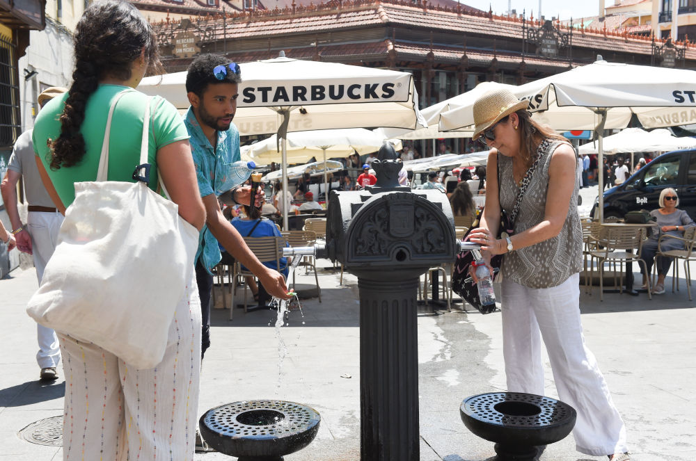 5月29日,人们在西班牙首都马德里街头接水消暑。新华社发(古斯塔沃·巴连特摄)