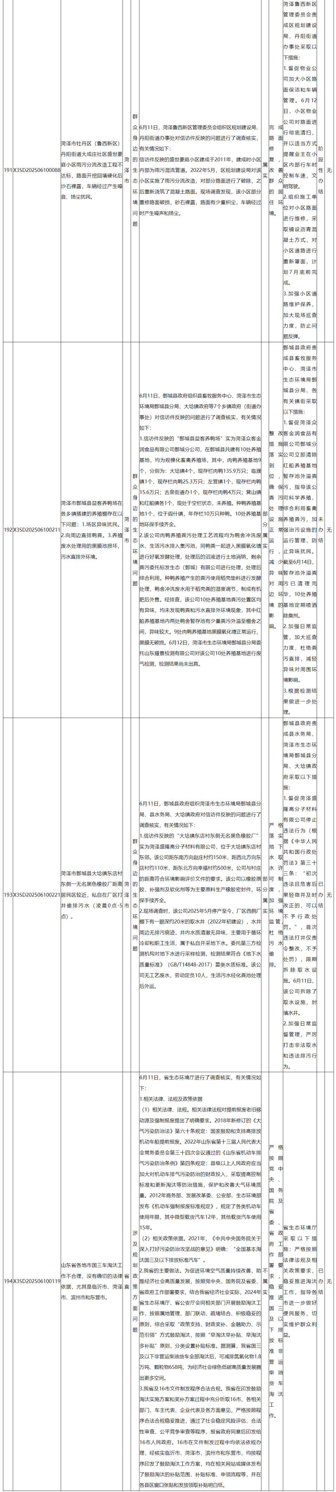 截至6月20日,中央第三生态环境保护督察组交办山东省的第十五批194件信访件,已办结94件,阶段性办结83件,未办结17件。其中,责令整改67家,立案处罚14家。根据督察要求,现予以公开。