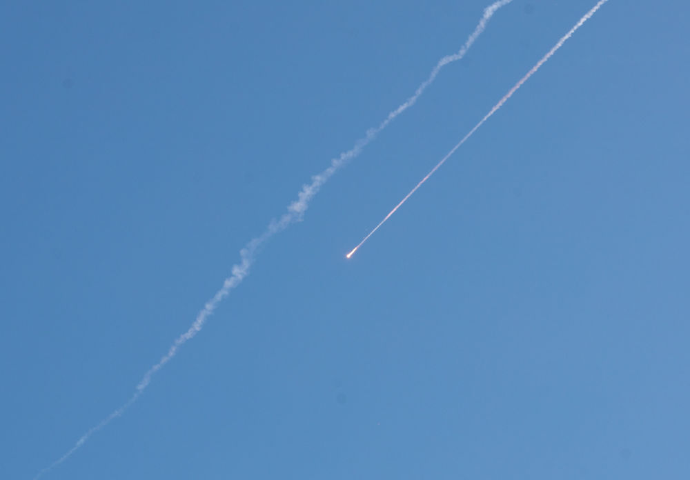 6月22日,以色列国防军说,已探测到伊朗向以色列发射导弹,目前正在进行拦截。图为在耶路撒冷上空拍摄到的导弹痕迹。新华社记者 陈君清 摄