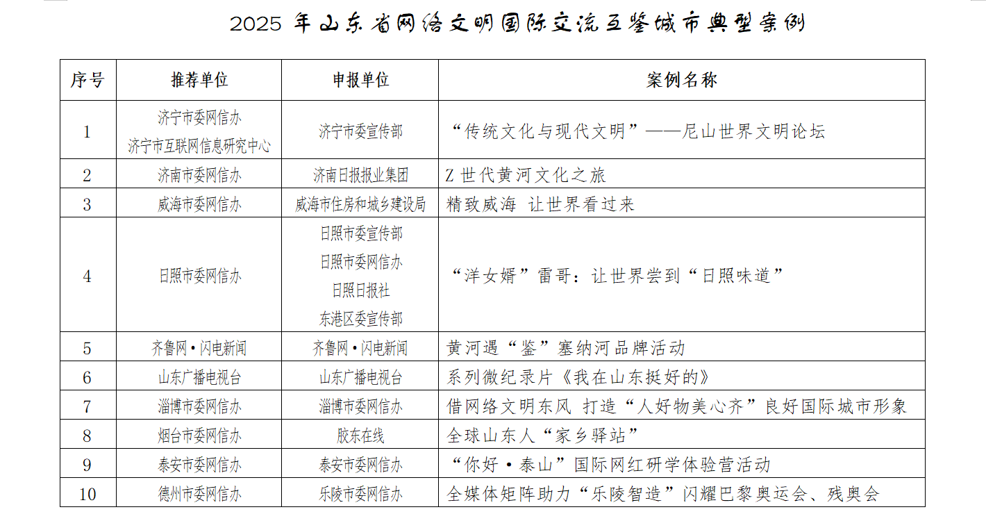 经过严格的评选程序,包括“‘传统文化与现代文明’——尼山世界文明论坛”“Z世代黄河文化之旅”“精致威海 让世界看过来”在内的10个典型案例脱颖而出,它们展现了山东省在网络文明国际交流领域的积极探索和生动实践。