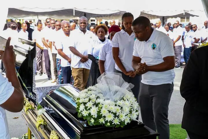 2025年6月20日,在坦桑尼亚达累斯萨拉姆穆欣比利国立医院,人们在追悼会上向张军桥医生遗体告别。新华社发