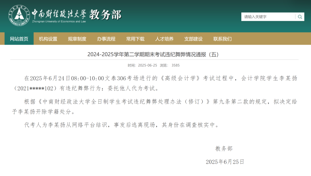 6月26日晚,中南财经政法大学官网发布通报: