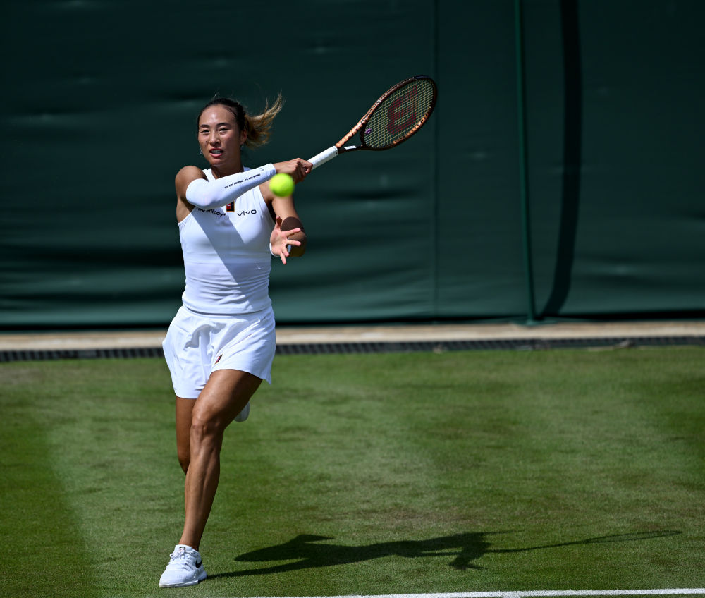 7月1日,郑钦文在2025温网女子单打首轮比赛中回球。新华社记者 李颖 摄